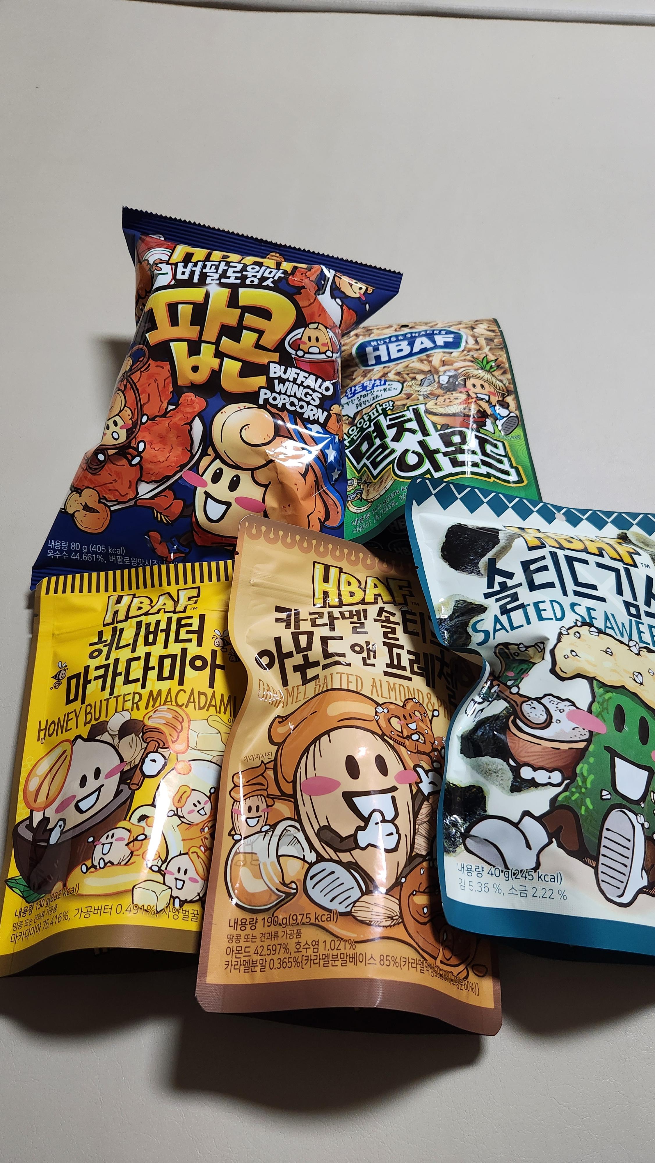 - 구매 제품: 버팔로윙맛 팝콘, 허니버터 마카다미아, 카라멜 솔트 아몬드 앤 프레첼, 솔티드 김스낵, 구운양파맛 멸치 아몬드
